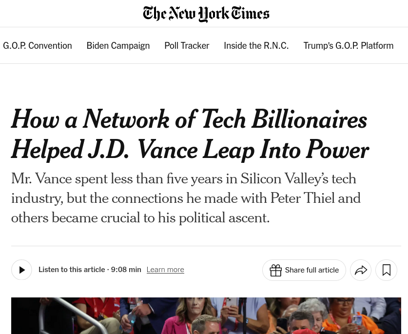 Lorsqu'on observe d'un peu plus près sa carrière et ses fréquentations des dix dernières années, une autre trajectoire se dessine. Ce qui apparaît en lieu et place du péquenaud Démocrate touché par la grâce de saint Trump, c'est un homme qui incarne, par son parcours, une coalition politique d'extrême-droite inédite, qui mêle l'appareil politique du "Grand Old Party" Républicain, gangrené par le trumpisme, à une poignée d'investisseurs autoritaires de la Silicon Valley et du capital-risque, tous réunis autour de concepts antidémocratiques théorisés dans les années 2000 par une poignée de blogueurs nerds