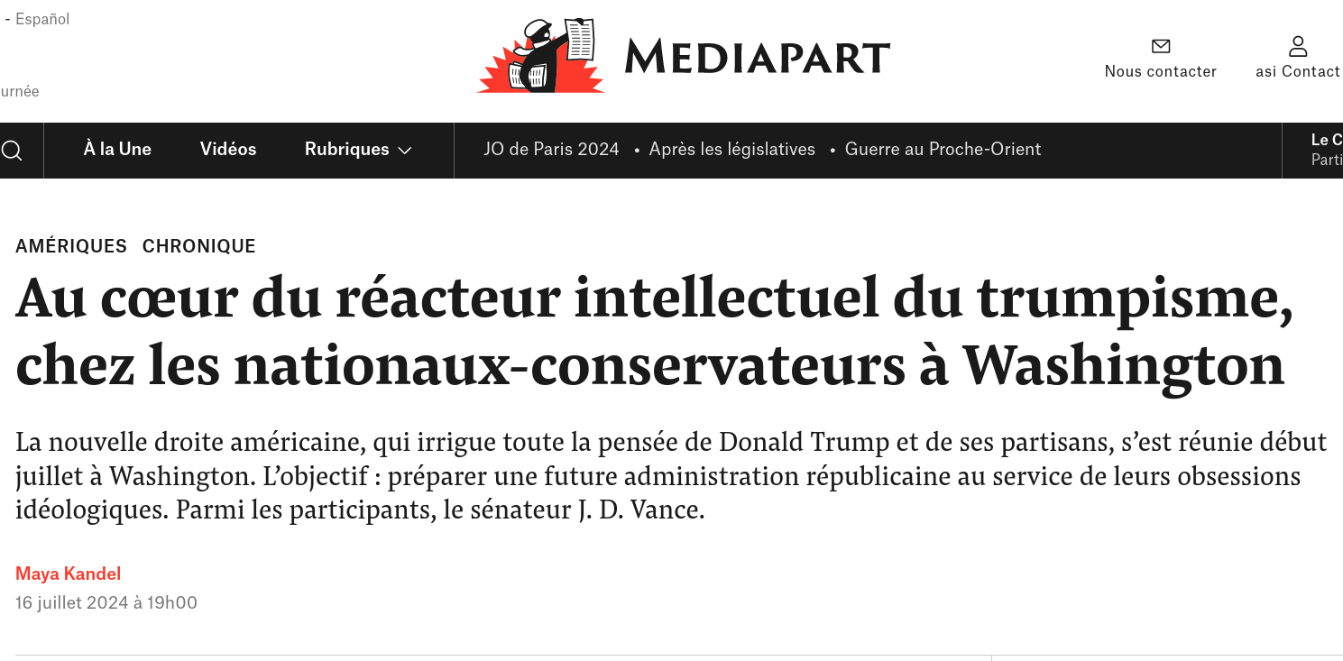 (New Right), une sorte de tumeur qui grossit et métastase inlassablement au sein du parti Républicain. Alors qu'elle s'impose comme une force politique majeure et que ses idées s'apprêtent à donner le ton du camp Républicain pendant toute la campagne présidentielle, la nébuleuse est encore trop peu cartographiée en France (à l'exception des excellentes synthèses de la chercheuse Maya Kandel, qui suit pour Mediapart les mutations de l'extrême-droite américaine et ses liens grandissants avec le techno-capital).