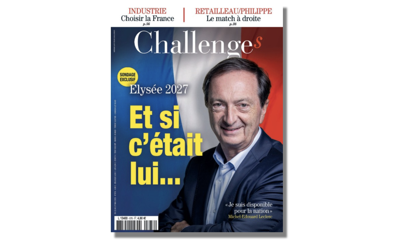 C'est une Une malicieuse, aux points de suspension longs comme les deux prochaines années électorales, qui s'affiche cette semaine dans les rues du pays. "Élysée 2027 : Et si c'était lui..." se demande l'hebdomadaire Challenges. Lui, c'est Michel-Édouard Leclerc, président du comité stratégique des supermarchés du même nom. L'homme se dit, sur la même Une, et sur fond de drapeau tricolore, "disponible pour la Nation".