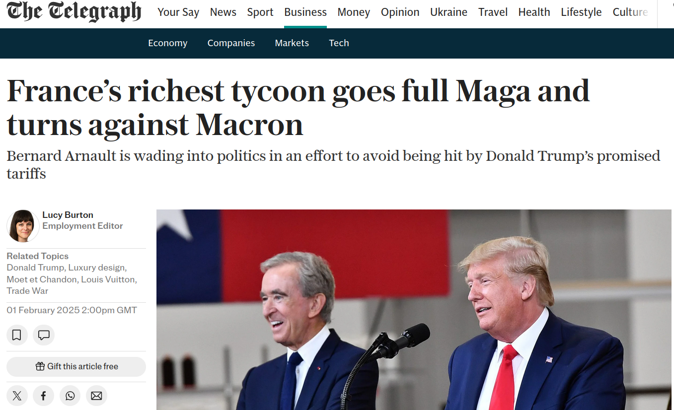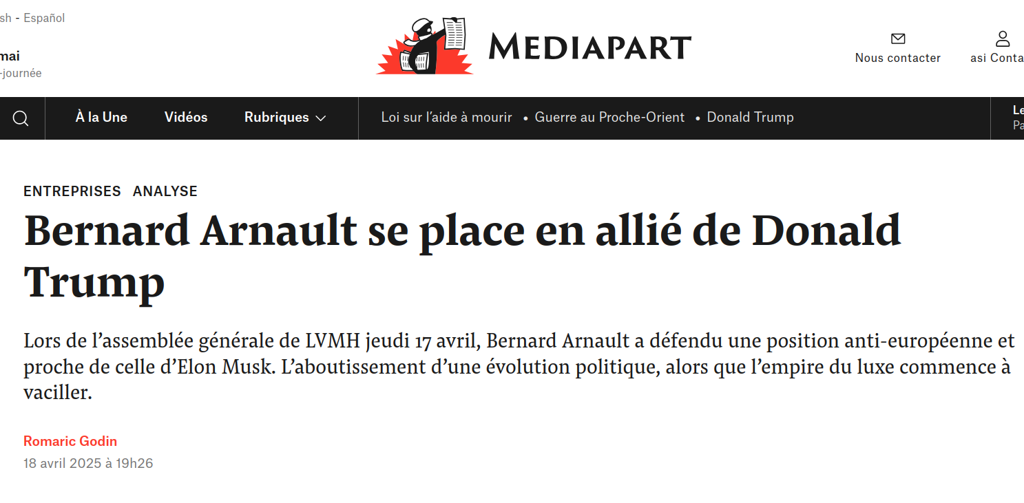 Rebelote en avril, en pleine assemblée des actionnaires de LVMH, où l'homme le plus riche de France vocifère contre l'Union européenne, "un pouvoir bureaucratique qui passe son temps à émettre des régulations", et rêve de faire "comme aux États-Unis, nommer quelqu'un pour «slasher» la bureaucratie". Du Musk dans le texte, alors qu'Arnault venait de tenter de négocier lui-même les droits de douane imposés par le président étasunien... pour se prendre une fin de non-recevoir. Dernier acte le 22 mai dernier, où Arnault, toute honte bue, conseillera à l'État de ne pas se mêler de son business... face à une commission d'enquête sénatoriale sur les aides publiques versées aux grandes entreprises. Ce, au moment où l'on apprenait que LVMH avait bénéficié de 270 millions d'euros d'exonérations de cotisations en 2023 et de près d'un milliard et demi d'euros en détaxe. Comme souvent, c'est vers la presse étrangère qu'il faut se tourner pour mettre les mots sur le phénomène : l'oligarque le plus riche de France, titre le Telegraph en février, a "viré totalement MAGA et désavoue Macron". Limpide.