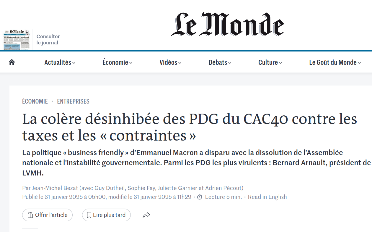 Bernard Arnault n'est pas le seul à faire sa crise de séparatisme sur fond de ralentissement de la croissance. Ben Smith (Air France-KLM), Guillaume Faury (Airbus), Florent Menegaux (Michelin), Patrick Pouyanné (TotalEnergies), Luc Rémont (EDF).... peu importe le secteur, recensait Le Monde en janvier, le patronat enrage comme un seul homme (cis, hétéro, blanc, vieux, très riche, détestable), pointant d'un doigt tremblant les mêmes moulins : "taxes", "règlements", "bureaucratie", "Union européenne", "écologistes", et tout embryon d'obstacle à leur frénésie d'accumulation parasitique. En agitant, encore et toujours, le chantage à la délocalisation, comme un conjoint toxique qui nous menacerait de mort lorsqu'on veut le quitter.