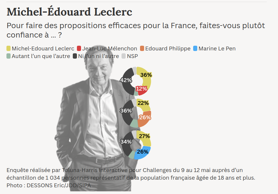 Pour légitimer a minima ce beau travail de politique-fiction, Challenges dégaine un sondage sur-mesure qui met face-à-face la fine fleur du capitalisme français et de la classe politique dans une joute électorale imaginaire : Leclerc battrait sans problème Mélenchon, s'en sortirait de justesse contre Marine Le Pen (des fois qu'elle retrouve une éligibilité dans ses affaires) et tomberait les armes à la main contre... Édouard Philippe. Et tant pis si la France est ici incarnée par 1034 sondés et que dans les trois scénarios, c'est le "ni l'un ni l'autre" qui l'emporte. Michel-Édouard 2027, on vous dit !