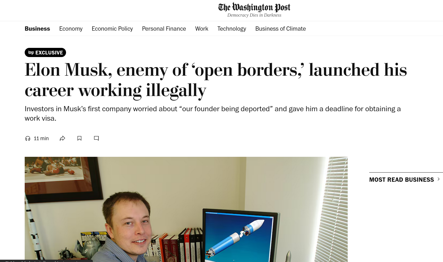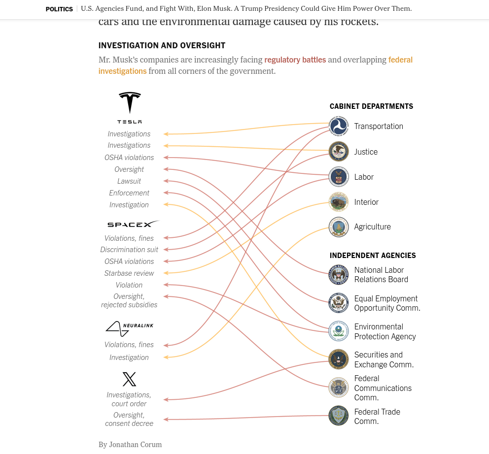 Musk n'a donc aucun problème à vendre les deux simultanément. Parce qu'il y croit, d'abord, mais aussi parce que la première fera fructifier le second. En cas de victoire du camp trumpiste, Musk s'est vu promettre la direction d'une nébuleuse commission chargée d'évaluer "l'efficacité" des dépenses publiques - le Department Of Government Efficiency, ou DOGE, du nom d'une cryptomonnaie absurde à l'effigie d'un Shiba Inu – et de supprimer 2000 milliards de dollars de dépenses publiques, soit un tiers du budget fédéral. Un poste administratif qui, en théorie, lui donnerait toute latitude pour couper stratégiquement dans les budgets des agences de régulation, alors que ses entreprises –Tesla, SpaceX, X et Neuralink – sont visées par une vingtaine d'enquêtes, ouvertes par 6 agences de régulation et 4 départements d'État. Et qui lui ouvrirait l'accès, remarque Rolling Stone, à une gigantesque niche fiscale personnelle.