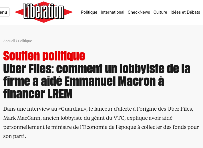 S'il y a scandale d'État, c'est au moins sur ce point : Macron, par conviction idéologique, a carrément aidé une entreprise étrangère à violer l'État de droit : Uber a refusé de fermer pendant neuf mois son service de conducteurs particuliers sans aucune licence, UberPop, ce qui lui vaudra une condamnation en septembre 2021 pour "concurrence déloyale". Le scandale, c'est de constater qu'un président en exercice, alors ministre de l'Économie, n'a même pas eu besoin d'être acheté pour privilégier Uber au détriment de l'intérêt général. Il s'est décarcassé pour eux. Parce que la radicalité de l'entreprise, sa "stratégie du chaos" décrite par l'enquête, rappelle à bien des égards la praxis du président : agressive, impatiente, autoritaire.
