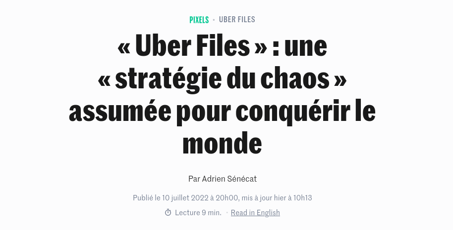 Raphaël Grably, chef du service tech pour BFMTV, a cette formule intéressante sur Twitter : "Les Uber files ne révèlent ni corruption, ni scandale d'État, mais la convergence de point de vue entre un ministre et une entreprise américaine qui méprise alors totalement la loi française." Peut-être que lui, comme les autres précités, ne réalise même plus à quel point cette "convergence", qui est en réalité une conversion (à sens unique) du public par le privé, représente une corruption du rôle théorique de l'État – la défense, rappelons-le, de l'intérêt général contre les attaques des oligarchies successives de l'histoire. Il est peut-être là, le tour de force réalisé par le monstrueux lobbying néolibéral d'Uber et de ses concurrents depuis dix ans : avoir réussi à persuader si profondément une minorité influente de la population (politique, médiatique et entrepreneuriale) que l'intérêt privé prime à ce point sur le bien commun que même transgresser la loi devient excusable, au nom de la sacro-sainte disruption économique. Uber n'a pas violé la loi, nous dit-on; c'est la loi qui ne s'est pas adaptée assez vite.