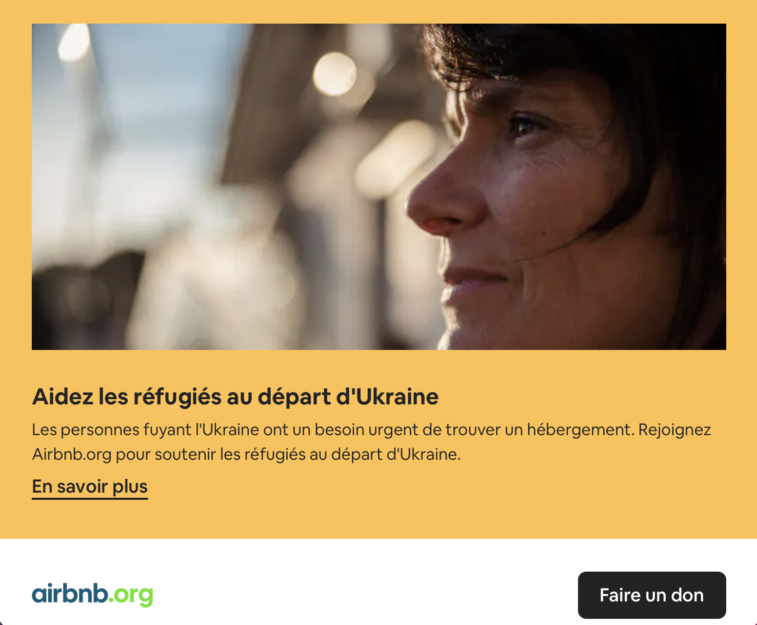 Pour achever de nous rassurer sur sa légitimité en tant qu'organisme humanitaire international, la plateforme nous rappelle son expérience dans le secteur de la politique d'accueil des exilés, que vous ignorez peut-être : "Ces cinq dernières années, Airbnb et Airbnb.org ont connecté plus de 54 000 réfugiés et demandeurs d'asile – venus de Syrie, du Venezuela et d'Afghanistan – à des hébergements temporaires". À l'été 2021, Airbnb s'est même occupé des réfugiés climatiques de Belgique, d'Allemagne et des Pays-Bas (littéralement) submergés par des crues. Comme un avant-goût du monde qui vient. Et il y a mieux : au début de la guerre, des utilisateurs du site ont eu l'idée de réserver des logements en Ukraine (sans y aller, évidemment) pour soutenir financièrement les victimes de la guerre. On appelle ça le "pay, not stay". Vous pouvez donc utiliser Airbnb pour transférer des fonds à des exilés, et accueillir chez vous ces mêmes exilés, toujours via Airbnb. Belong anywhere. Soyez chez vous, partout.