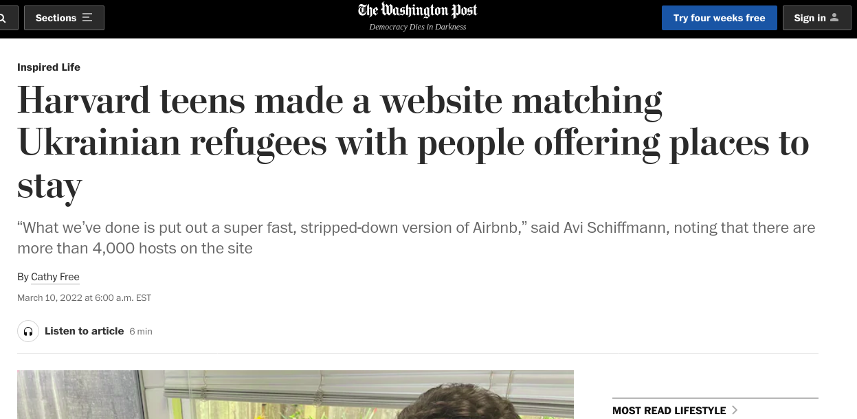 Ils s'appellent Avi Schiffmann et Marco Burstein, ils ont 18 et 19 ans, ils étudient à Harvard. Le 3 mars dernier (la légende médiatique raconte déjà trois jours et trois nuits à coder sans dormir), ils ont lancé Ukraine Take Shelter, un site de mise en relation entre réfugiés ukrainiens et européens désireux d'accueillir. Traduit en une vingtaine de langues, le site, pensé pour être fonctionnel plutôt qu'esthétique, permet de sélectionner sa ville de destination, le nombre de gens à accueillir, la durée du séjour, la langue parlée et une dizaine d'autres paramètres (accueil des animaux, des enfants, assistance médicale et légale, etc...). Une liste de propositions s'affiche, ainsi qu'un numéro Whatsapp ou un email, pour communiquer gratuitement. L'histoire est irrésistible, et les rédactions l'exploitent : nouvelle itération des p'tits-geeks-qui-vont-sauver-le-monde, version action humanitaire internationale. En quinze jours, le site collecte 20 000 logements et atteint un million d'utilisateurs, générant encore plus d'attention médiatique... et de critiques.