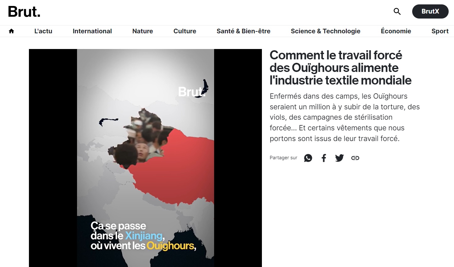 Dans une sorte de transe journalistico-publicitaire, Brut dénonce et cautionne à la fois, à la manière des magazines de mode qui prônent l'acceptation de l'âge tout en refourguant à leurs lectrices des crèmes rajeunissantes. Lors de Médias en Seine, François Saltiel a tout de même pointé que Brut pouvait ainsi dénoncer le travail forcé des Ouïghours qui alimente l'industrie textile mondiale (comme Adidas et Puma, ou Nike). Et proposer dans le même temps un "reportage" très positif pour Nike sur les investissements de la marque auprès des enfants – "partenariat rémunéré", précise au moins la version Facebook, tandis que sur le site de Brut, aucune indication n'est faite, là encore, de la nature publicitaire de la vidéo.