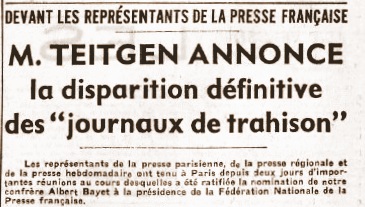 du 15 septembre 1944 transcrit les propos du rédacteur politique de l'AFP : "La presse quotidienne est représentée par les journaux qui furent interdits ou se sabordèrent au moment de l'Armistice, et par la jeune presse qui grandit et se fortifia dans la clandestinité. Les nuances politiques des uns et des autres permettent de constater que nous jouissons à nouveau, à Paris, d'une presse libre tout entière animée d'un patriotisme ardent. Les anciens journaux vendus à l'ennemi sont morts. La presse libre de Paris occupa, en accord avec le gouvernement, les bureaux et ateliers des journaux disparus