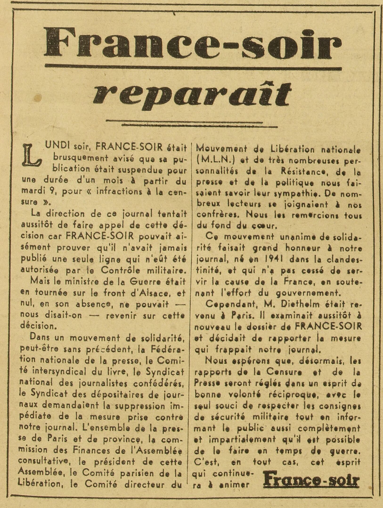 ". Le tollé est tel que la suspension est rapidement abandonnée et dès le 12 janvier 1945, France-Soir