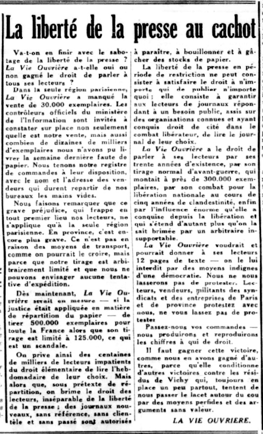 Le mois de janvier 1945 apparaît comme un point de rupture entre le gouvernement et la presse écrite : la pénurie de papier s'est aggravée - ou plutôt la pénurie de moyens de transport pour acheminer le papier depuis les stocks acquis au Canada, la priorité étant donnée au charbon - ce qui contraint le gouvernement à réduire de moitié la pagination de l'ensemble de la presse, réduite à une simple feuille recto-verso dès décembre 1944. Les protestations de la presse et de la Fédération Nationale de la Presse Française (FNPF) qui parle "d'un coup de force contre la presse