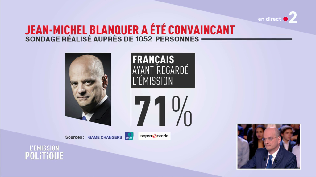 “Uf…”, a réagi Léa Salamé, micro ouvert. Elle aurait pu dire “ouaf”, tellement le score est énorme. Jean-Michel a littéralement explosé le compteur de satisfaction. D’après le sondage de fin d’émission, le ministre de l’Education a convaincu 71% des téléspectateurs de France 2.