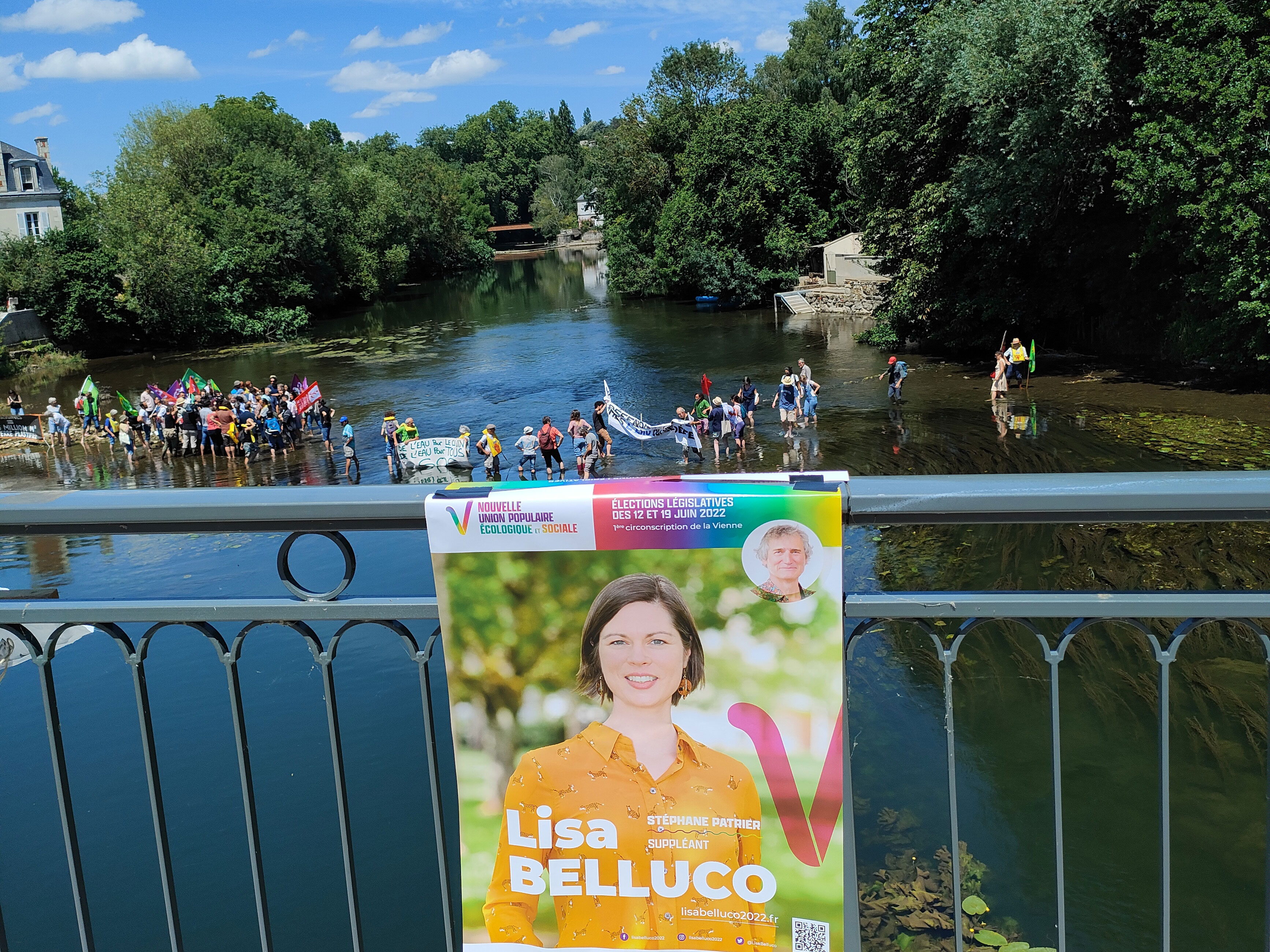 La traversée du Clain à pied pour illustrer les ravages de plus en plus précoces de la sécheresse (24 départements en alerte sécheresse début juin) est désormais un rite annuel, qui est aux écolos locaux ce qu'était l'ascension annuelle de la roche de Solutré pour François Mitterrand. Elle se pratique sous le pont Joubert, pour permettre aux photographes et aux télés de traverser à pied – vraiment – sec. Courageuse (et bottée), France 3 Poitou-Charentes a suivi Mélenchon sur la rivière. Une interview en situation, c'est tout de même mieux, pour illustrer l'obligatoire titre de la presse locale : "Mélenchon marche sur l'eau"