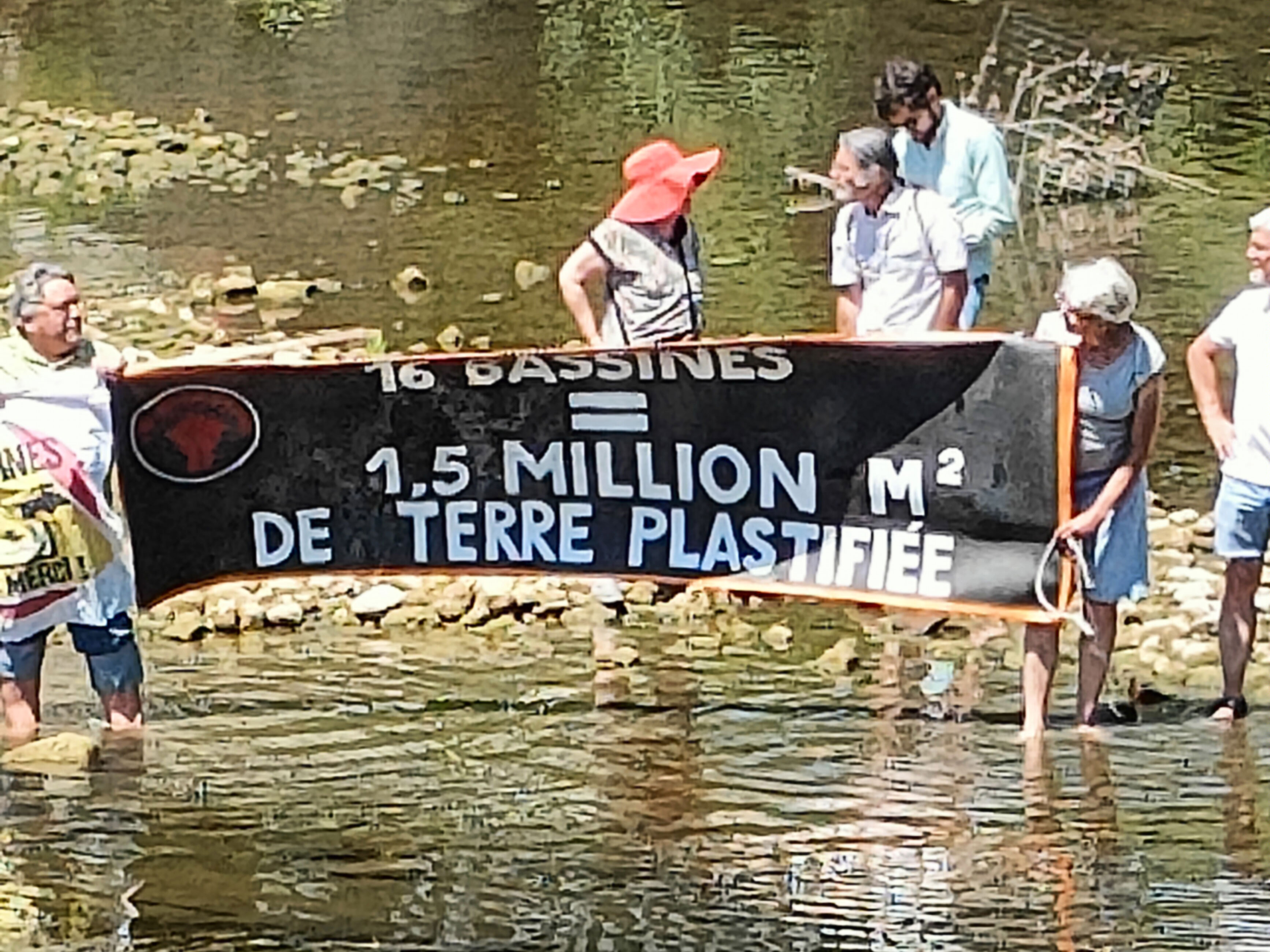 Traversée faite, la troupe s'installe pour une conférence de presse / meeting devant la banderole "Bassines non merci". Les bassines, ces méga-retenues d'eau alimentées l'hiver par les nappes phréatiques pour irriguer au cours de l'été, sont "clairement le symbole de l'investissement massif pour un modèle appelé à se fracasser",