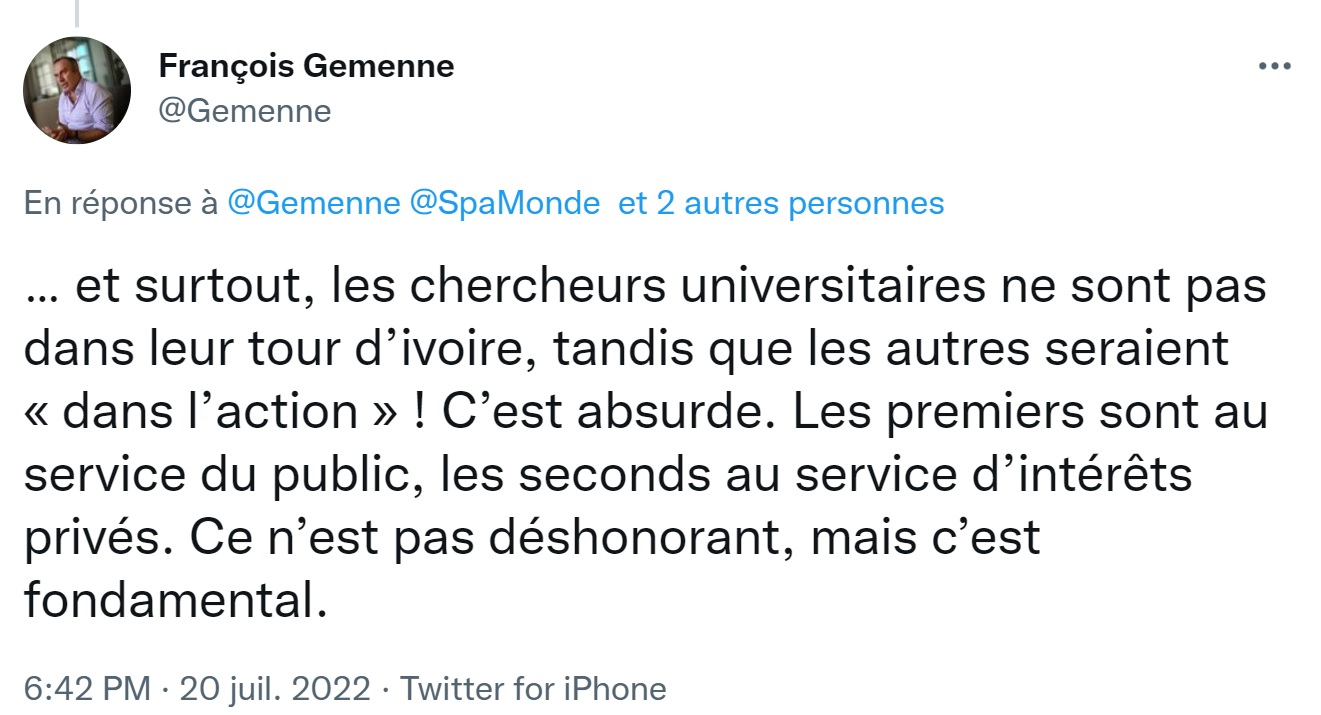 , estime François Gemenne, lui-même… chercheur sur le climat et les migrations. Chercheuse ou consultante, nuances trop subtiles ? Non. "Les premiers sont au service du public, les seconds au service d’intérêts privés