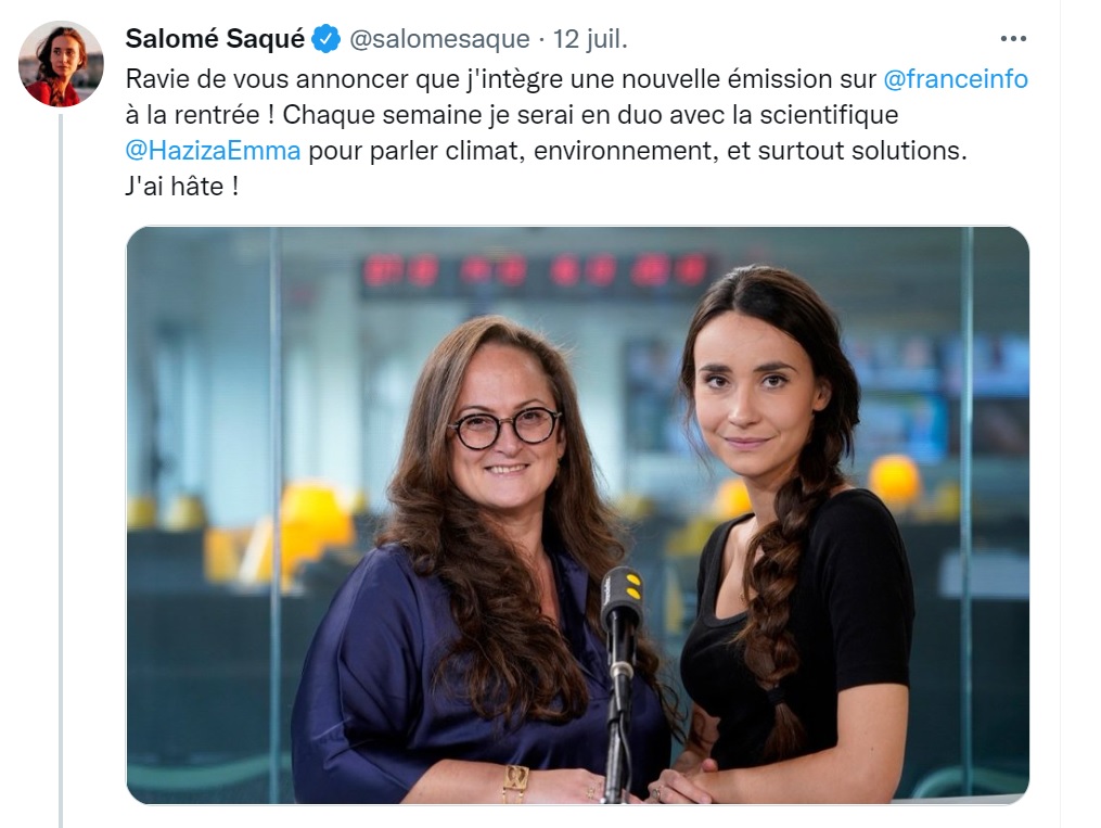 C'est la super affiche écolo de Franceinfo pour la rentrée. Une émission hebdomadaire 100 % femmes, 100 % écolo. À ma droite, Salomé Saqué, journaliste "climat" au site Blast