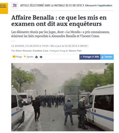De quelles complicités précises, au sein de l'équipe présidentielle et de l'appareil d'Etat, a bénéficié cette étrange tentative de constitution d'une milice de police parallèle ? On ne le sait pas encore. Ce sera aux enquêtes de le déterminer. Si le pouvoir les laisse faire. Il est difficilement compréhensible par exemple que Benalla ait été laissé en liberté après, selon les PV publiés par Le Monde, son refus de coopérer lors de sa garde à vue (refus de remettre les clés de son domicile, et de fournir une clé USB où figureraient des données sur ses communications téléphoniques), qui peut laisser craindre une évaporation de preuves. Pour une bagarre le hall de l'aéroport Orly 1, deux rappeurs viennent d'être condamnés à un mois de détention préventive. Passons encore.