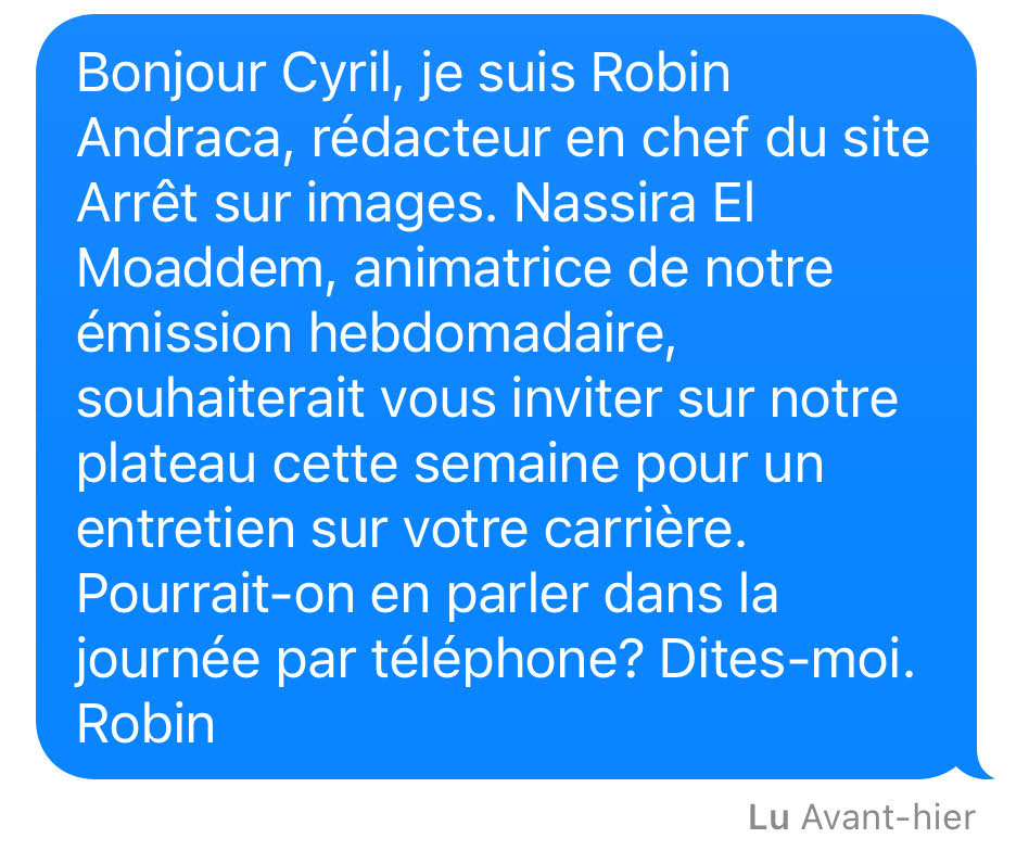 25 février, 16h46, mon téléphone sonne, le nom de Cyril Hanouna s'affiche sur l'écran. Je sais pourquoi il m'appelle. La veille, à 12h14, je lui ai envoyé le texto suivant :