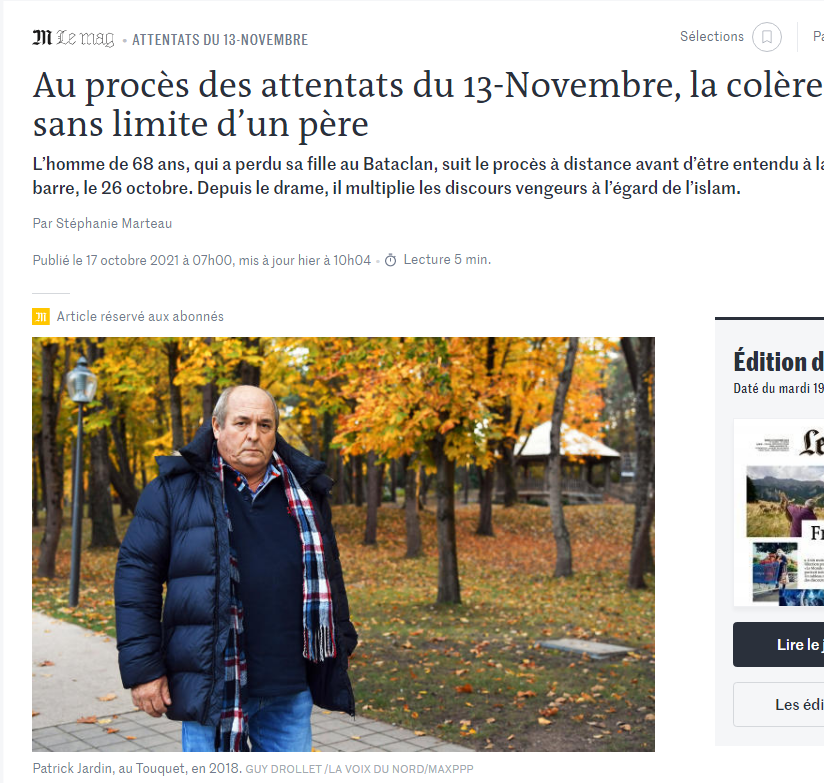 Que faire de la haine d'un père ? Patrick Jardin n'est pas une partie civile comme les autres. "Le père de Nathalie, 31 ans, tuée au Bataclan, viendra à la barre pour