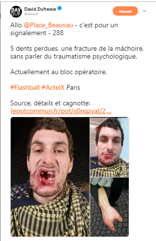 Quand je dis "enfin", je ne plaisante pas. Nous avons fouillé toutes les archives des JT depuis le début du mouvement. Jusqu'aux exploits toulonnais du commandant boxeur Andrieux le 5 janvier, aucun sujet de JT de TF1 ou France 2 n'a été centré sur les violences policières. Ce faisant, on a épargné aux âmes sensibles les images de mâchoires ou de paupières fracassées, comme celle-ci.