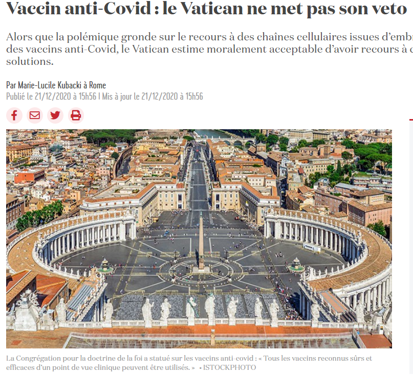 nous apprenait le 21 décembre dernier que pour le Vatican, "tous les vaccins reconnus sûrs et efficaces d’un point de vue clinique peuvent être utilisés, en ayant conscience que le recours à de tels vaccins ne signifie pas une coopération formelle à l’avortement".