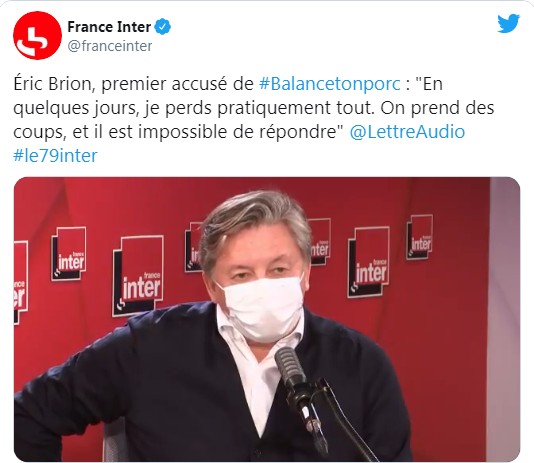 ", dit Eric Brion, au micro de Léa Salamé. Ancien patron de la chaîne Equidia, Brion est le porc inaugural de la vague #balancetonporc. C'est lui, qui a été nommément dénoncé par la journaliste Sandra Muller, autrice en 2017 de deux tweets successifs, à quatre heures d'intervalle. Le premier : "#balancetonporc !! toi aussi raconte en donnant le nom et les détails un harcèlement sexuel que tu as connu dans ton boulot. Je vous attends »