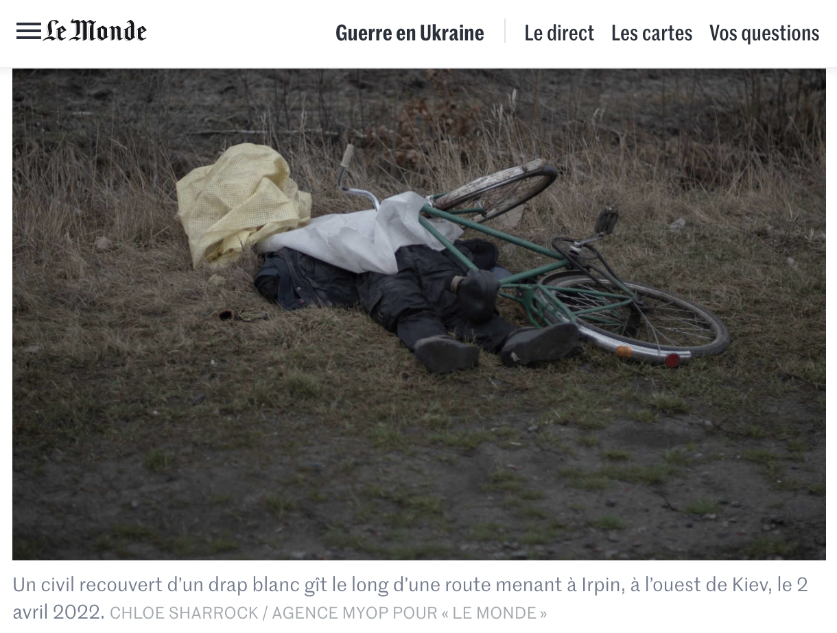 D'abord on n'y croit pas. Trop c'est trop. Ces corps de civils dispersés dans la rue principale de Boutcha, assassinés souvent d'une balle dans la nuque, ces quelque 410 victimes civiles, tuées par armes automatiques, dénombrées dans les territoires libérés selon la procureure générale d'Ukraine, trop c'est trop. Et les ongles peints d'une femme. Et les morts à vélo, comme le montre cette photo du Monde