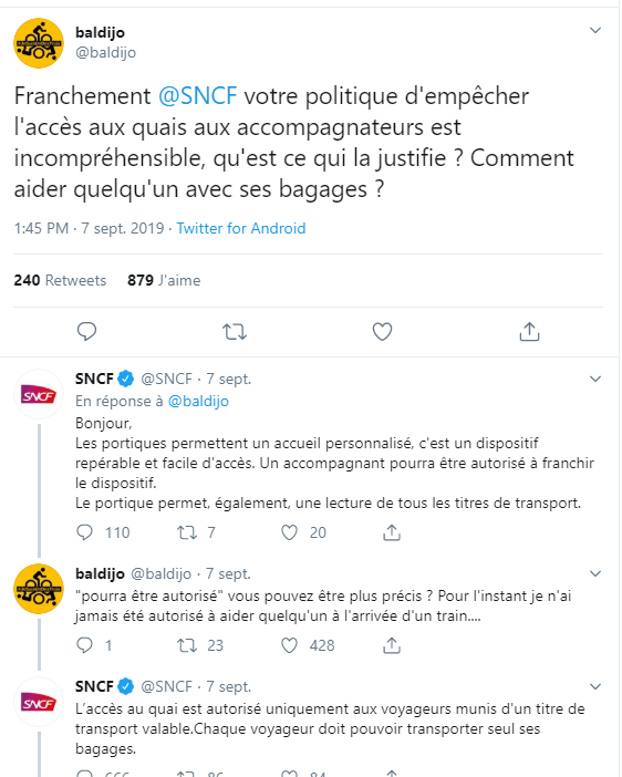 C'est une histoire d'aujourd'hui. Au cours du dernier week-end, un internaute interpelle la SNCF sur Twitter, à propos des portiques installés sur les quais d'embarquement des TGV dans quatorze gares, dont les quatre gares parisiennes. "Comment aider quelqu'un avec ses bagages ?"