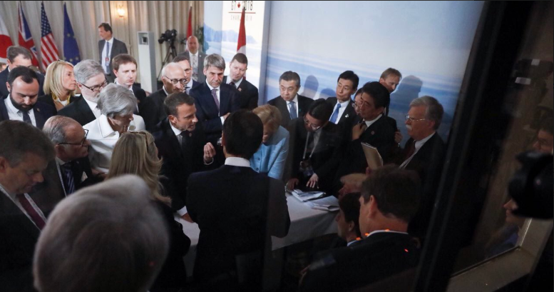 Fiasco Merkel, ou fiasco Macron ? La photo du fiasco Merkel est apparue partout, après que Trump a décidé, en deux tweets, de retirer sa signature du laborieux communiqué final du sommet du G7, au Québec. Mais peut-être cette photo, prise par les communiquants de la chancelière allemande, est-elle trompeuse. C'est peut-être Macron (si si, il est aussi sur la photo) qui, à cet instant précis, est en train de s'adresser au personnage assis, comme le suggère une autre photo plus laborieuse tweetée, elle, par Macron.