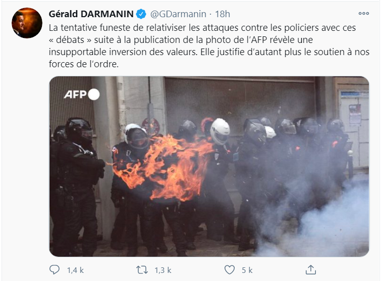) ont raconté l'épisode, et publié le témoignage de la photographe de l'AFP. Normal. L'histoire pourrait s'arrêter là. Mais elle ne s'arrête pas là. La photo de ce policier en feu était trop bienvenue, pour tous ceux qui souhaitent rééquilibrer les récits des violences en manifestation, en montrant que des policiers y sont aussi blessés, et parfois en nombre important. Ne nous cassez pas notre image ! somment lesdits comptes de syndicats policiers, quelques ténors de la fachosphère, bientôt rejoints, ô surprise, par le ministre de l'Intérieur Gérald Darmanin.
