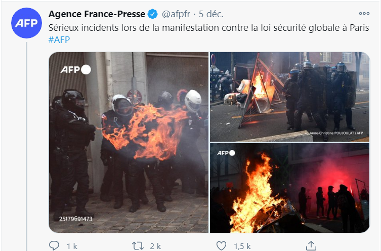 Qu'importe la réalité, du moment que le récit sert la cause. À la base du dernier épisode en date de la production de fake news officielles, la diffusion sur Twitter par l'AFP d'une photo d'un policier semblant la proie des flammes, lors d'une manifestation contre la loi Sécurité globale, samedi 5 décembre, à Paris.