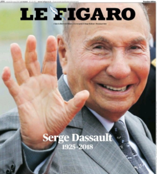 , sous la plume de François-Xavier Bourmaud, évoque les condamnations et mises en examen de son actionnaire, Serge Dassault, mort hier dans son bureau, à 93 ans. Quant à l'article consacré à la carrière d'élu du disparu, dans l'Essonne, rédigé par son confrère Guillaume Tabard, c'est encore mieux : pas un mot. Sept mots, donc, pour résumer aux lecteurs du Figaro