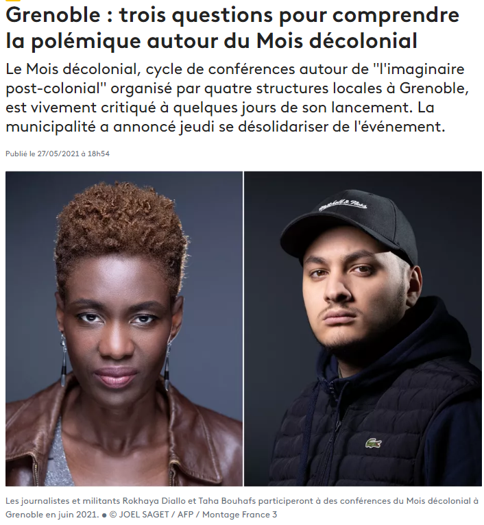 ), à propos du "mois décolonial" de Grenoble. À la suite des manifestations d'indignation habituelles (Dupont-Aignan, Wauquiez, Ciotti, etc), la mairie de Grenoble, l'université et l'institut d'études politiques viennent en effet de demander aux organisateurs de ce "Mois décolonial" de retirer leurs logos des affiches, n'étant pas "partenaires" de la manifestation, qui souhaite "déconstruire l'imaginaire colonial"