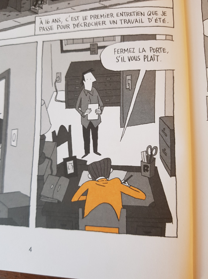intime, page 4, le directeur de l'usine au jeune homme qui vient solliciter une embauche pour l'été. "Tu peux fermer la porte, s'il te plait ?"