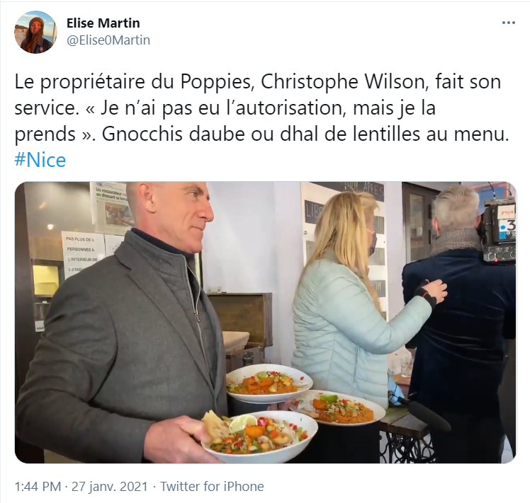 ). Il parait que les convives seront verbalisés, comme le sera certainement le patron, dont le préfet des Alpes-Maritimes en personne a révélé hier soir qu'il était en garde à vue (générant immédiatement le hashtag #liberezChristophe). Quant au cuisinier du Poppies, étranger en situation irrégulière, le préfet a précisé qu'il était, comme il se doit, placé en rétention. Aucun hashtag des désobéissants n'est à signaler à son sujet, à l'heure où est rédigée cette chronique.