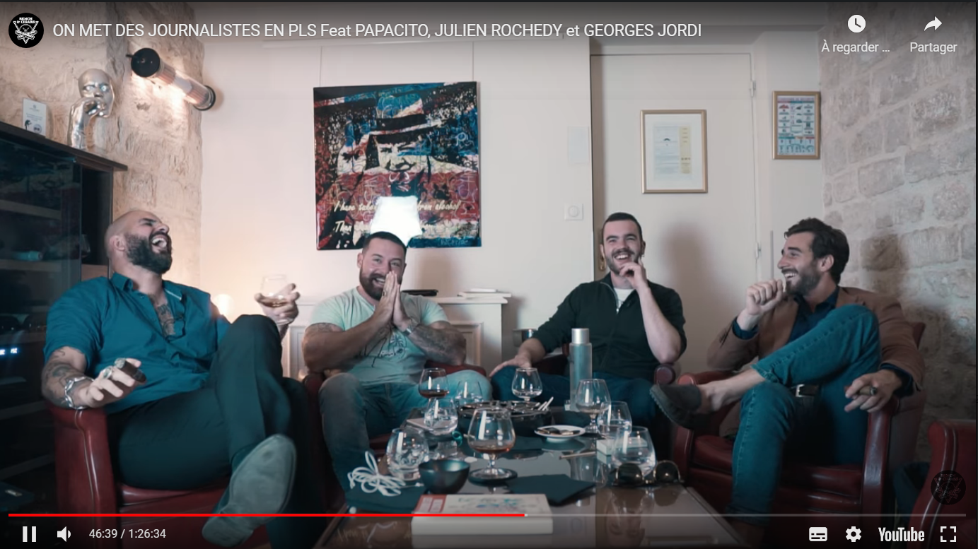 À l'image, cela donne un festival de testostérone tatouée, de gros cigares (l'émission est sponsorisée, si je comprends bien, par une alliance cigares / couteaux / caleçons) et de rires alcoolisés. Mais sous les rires, un chapelet d'insultes ordurières. Pas tellement contre moi, qui hérite du surnom sympathique de "Dany the Dog", mais contre notre journaliste Maurice Midena, et nos invité·es (ce point médian est gracieusement offert à Papacito) Paul Conge (Marianne)