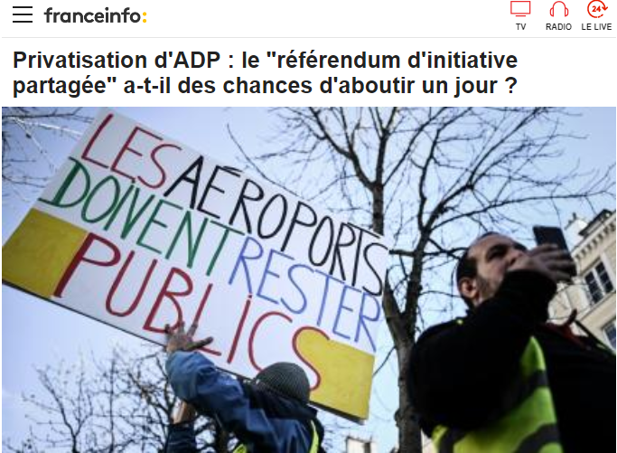 méconnaissent simplement l'Histoire : l'imprévisible dynamique d'un rapport de forces. Avec tout le respect dû à ce constitutionnaliste, les citoyens se mobiliseront d'autant plus que l'on saura leur expliquer les implications, économiques et écologiques, de cette privatisation (à cet égard, on ne relira jamais assez cet exposé des ambitions de Vinci). Et d'autant moins que Franceinfo leur aura martelé que ça ne marchera jamais.