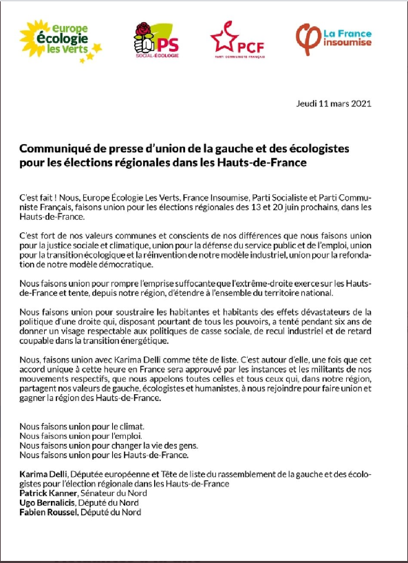 C'est fait. Il y a peut-être toutes sortes d'arrière-pensées, mais c'est fait. L'eurodéputée écologiste Karima Delli conduira une liste d'union de la gauche aux élections régionales des Hauts-de-France. Toute la gauche ? Toute la gauche : EELV, PS, PCF, Insoumis. "En recevant le communiqué commun, on s'est frottés les yeux devant tous ces logos, qu'on n'avait plus l'habitude de voir ensemble"