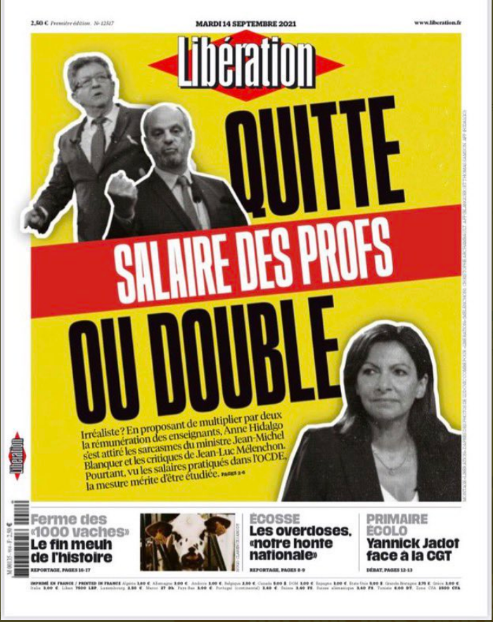 , avec un visuel rangeant donc Hidalgo dans le camp des audacieux, et Mélenchon, au côté de Blanquer, dans celui des radins, indifférents au salaire des profs. Hurlements des Insoumis, qui font valoir à juste titre que le programme de Mélenchon prévoit, non pas le doublement, mais le rattrapage du gel du point d'indice du traitement des enseignants, soit au total une augmentation de 30% environ pour l'ensemble des enseignants, comme le rectifie une enquête de CheckNews, au lendemain de la Une fatale. A Mediapart