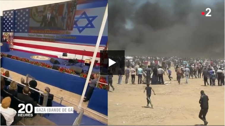 Heureusement pour l'iconographie mondiale, Israël a fourni cette fois-ci une image au massacre. Plus précisément, l'image d'un contraste, entre le crime de guerre perpétré à Gaza, et la cérémonie d'inauguration, par Ivanka Trump, de l'ambassade américaine à Jerusalem. Ce contraste, on peut le signifier par le simple glissement d'une image à l'autre, un "split screen" évocateur, comme ici le 20 Heures de France 2...