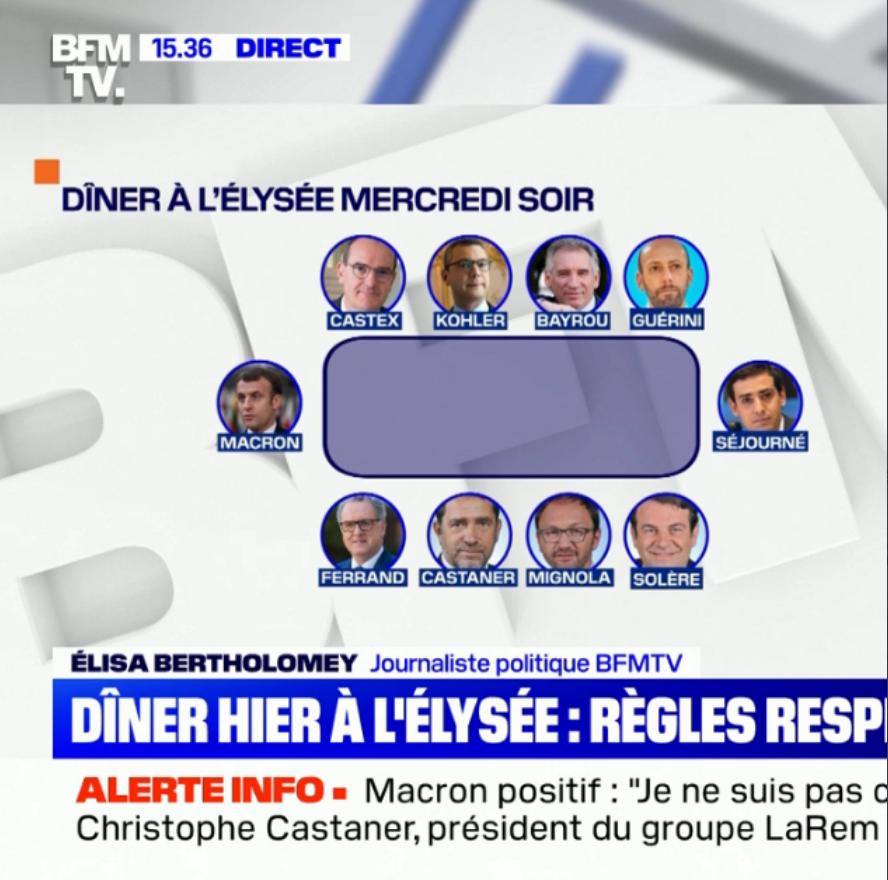 dîner au grand jeu du kikacontaminéki du Tout Etat. Avec schéma du plan de table, où l'on apprend que le rang protocolaire des convives détermine directement leur risque d'être cas contact des postillons présidentiels. Mieux vaut donc, comme s'en amusait Mélenchon à propos d'un repas précédent, être placé en bout de table.
