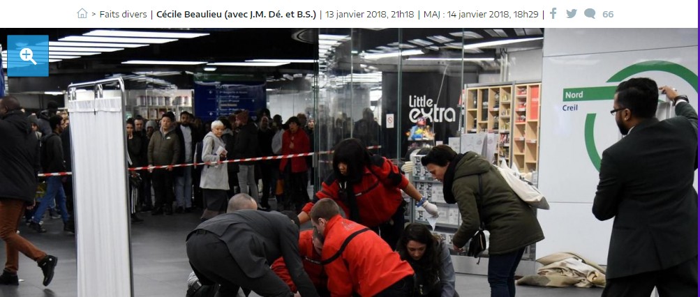 Le Parisien, lui aussi, a relayé l'indignation des réseaux sociaux. Mais à la différence des autres journaux, Le Parisien a illustré la mort de Andy avec un vrai scoop : une photo de la scène elle-même. Celle-ci (j'en ai délibérément coupé le bas, où l'on voit le corps sous une couverture de survie). On y voit clairement les personnels de la RATP et des services d'urgence penchés sur le corps du jeune homme.