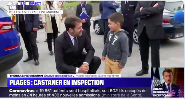 On ne saurait mieux signifier que les servants suprêmes de la nouvelle religion des gestes barrière n'y croient pas eux-mêmes (voir aussi Castaner démasqué, en visite d'inspection sur une plage normande). Les gestes barrière, c'est pour les corps vulnérables du peuple. Nos corps à nous sont invulnérables. Où est le courage ? Dans le port, ou dans le non-port ? Ce qu'on leur demande -pour autant qu'on leur demande quelque chose- est-ce l'affectation verbale du courage personnel, ou simplement, banalement, tristement, de l'exemplarité ?