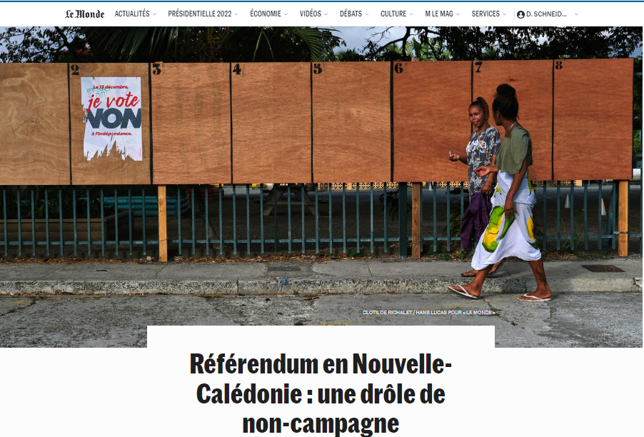 Ainsi l'interminable processus des accords de Nouméa se termine-t-il en farce tragique, avec un référendum boycotté par les indépendantistes du FLNKS, et donnant 96 % des suffrages au maintien de la Nouvelle-Calédonie dans la République française (la participation stagne à 44%). Quasi-seul dans la classe politique comme d'habitude, Mélenchon en conclut que ce vote est nul et non avenu, tandis que Jadot l'analyse comme "légal"