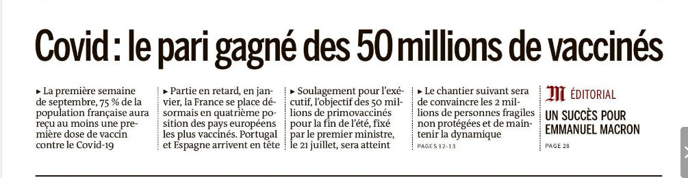 . 50 millions de Français auront été vaccinés à la fin de l'été. Cela avait mal commencé. La France faisait la course en queue. Tout le monde se souvient de la honte Mauricette. "Puis les doses sont arrivées et le chef de l’État a parlé au cœur de l’été"