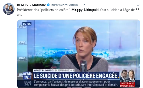 Depuis deux ans, Maggy Biskupski était apparue sur plusieurs plateaux de télévision. Je visionne ce matin ses interventions. Le mot qui revient le plus souvent, plutôt que cette colère qui transparait de sa page Facebook (voir ci-dessus) c'est souffrance. Elle parle aussi de suicide, du suicide des collègues. Elle parle des dotations inadaptées de matériels. Elle parle de la surdité de l'institution policière. Normal. Dans le fameux extrait de l'émission d'Ardisson, à la rentrée dernière, où Yann Moix évoque devant elle "les policiers qui chient dans leur froc"