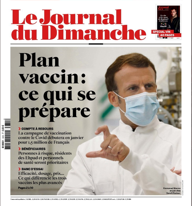 lequel journal a peut-être des indices sur le coupable, ayant publié voici quelques semaines cette autre Une sur la clownesque stratégie vaccinale de la France. Il devrait être possible d'identifier le sinistre individu masqué qui y figure.