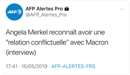 Branle-bas sur les réseaux sociaux, et dans les rédactions. Sur les réseaux sociaux, sur le mode "vous voyez bien, il est tellement insupportable que personne ne peut s'entendre avec lui". Et dans les rédactions, on prépare déjà les rétrospectives sur la guerre de 70. Mais deux heures plus tard, l'AFP corrige (sans indiquer néanmoins clairement qu'il s'agit d'un correctif)...