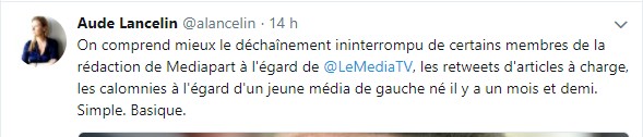 Mediapart, pour ses dix ans, ayant annoncé (outre sa nouvelle charte de déontologie) son intention de fonder une chaîne de télé, Aude Lancelin, journaliste au Media