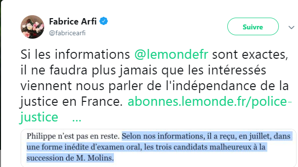 Mais le gros morceau, celui qui ne passe décidément pas, c'est le traitement par le site de cette enquête préliminaire (préliminaire, c'est à dire dirigée par un procureur dépendant du gouvernement) sur la campagne de la France Insoumise. Tout en dénonçant depuis toujours la sujétion des procureurs au gouvernement, tout en appelant depuis toujours à leur émancipation, Mediapart peut-il se gorger sans distance des révélations nées d'une telle enquête, soupçonnable par définition d'être une manip gouvernementale ? Rappelons par exemple les mots très justes et particulièrement définitifs de Arfi lui-même, pas plus tard que le mois dernier, alors qu'on apprenait que les candidats procureurs de Paris passaient des oraux à Matignon et à l'Elysée.